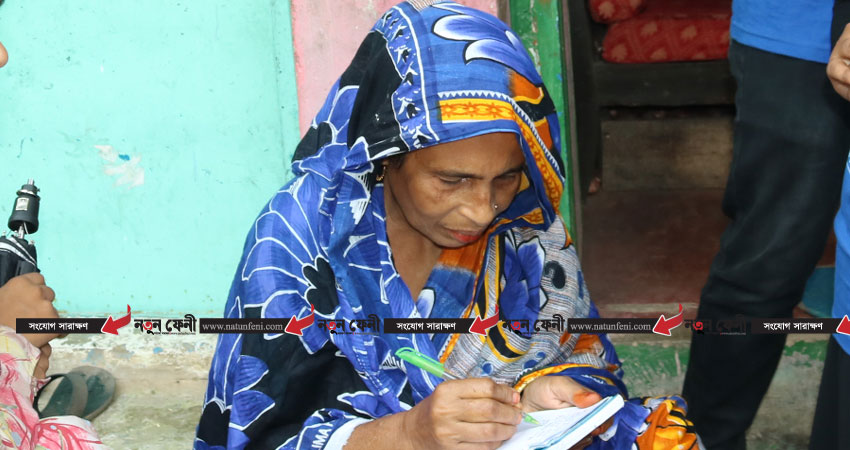 ফেনী শহরের নাজির রোড় এলাকার শেখ বাড়ীর পঞ্চাশোর্ধ ছবুরা খাতুন। মঙ্গলবার বেলা ১১টায় ‘আঁই টিপ সই করি ন’ প্রকল্পের কর্মীরা ওই বাড়ীতে গিয়ে স্বাক্ষর জানেন কিনা জিজ্ঞেস করলে তিনি জানান ‘আগে হাইত্তাম অঁন ভুলি গেছি’। প্রকল্পের কর্মীরা খাতা কলম দিয়ে স্বাক্ষর শেখাতে শুরু করেন।