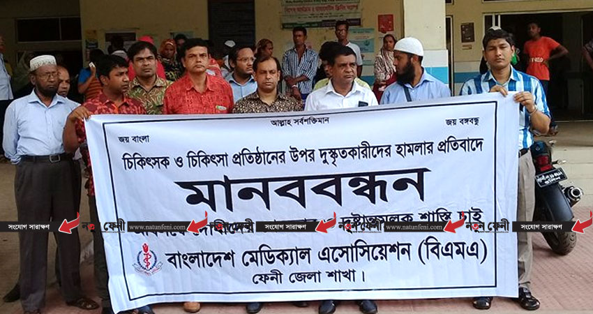 চিকিৎসক ও চিকিৎসা প্রতিষ্ঠানে হামলা-ভাংচুরের প্রতিবাদে ফেনীতে মানববন্ধন করেছে বাংলাদেশ মেডিকেল এসোসিয়েশন বিএমএ। বৃহস্পতিবার দিনভর জেলার বিভিন্ন স্থানে মানববন্ধন কর্মসূচি পালিত হয়।